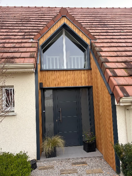 Aujourd’hui, zoom sur un magnifique habillage d’entrée réalisé en bardage faux claire-voie Douglas