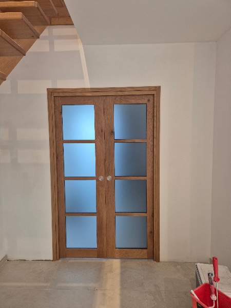 Nous vous présentons cette belle double porte à galandage en bois avec vitrages dépolis, installée pour séparer la pièce de vie du hall d’entrée dans cette maison actuellement en fin de réalisation